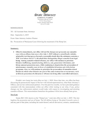 Florida’s new hemp law took effect on July 1, 2019. Since that time, our office has been discussing the prosecutorial impact of the law with elected representatives, other State Attorney’s Offices, and our law enforcement partners. Over the past two months, we have provided guidance consistent with this memorandum within our office while waiting to see what, if any, policy changes our law enforcement partners would make with respect to investigating and arresting cannabis offenses. This memorandum formalizes the guidance ASAs have already been given.