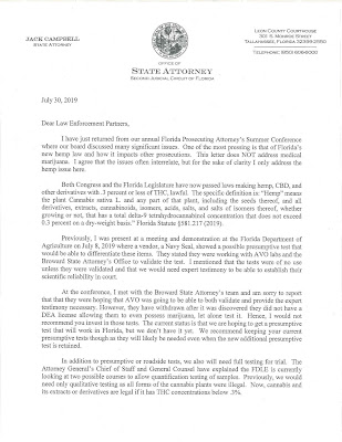 I have just returned from our annual Florida Prosecuting Attorney’s Summer Conference where our board discussed many significant issues. One of the most pressing is that of Florida’s new hemp law and how it impacts other prosecutions. This letter does NOT address medical marijuana. I agree that the issues often interrelate, but for the sake of clarity I only address the hemp issue here.